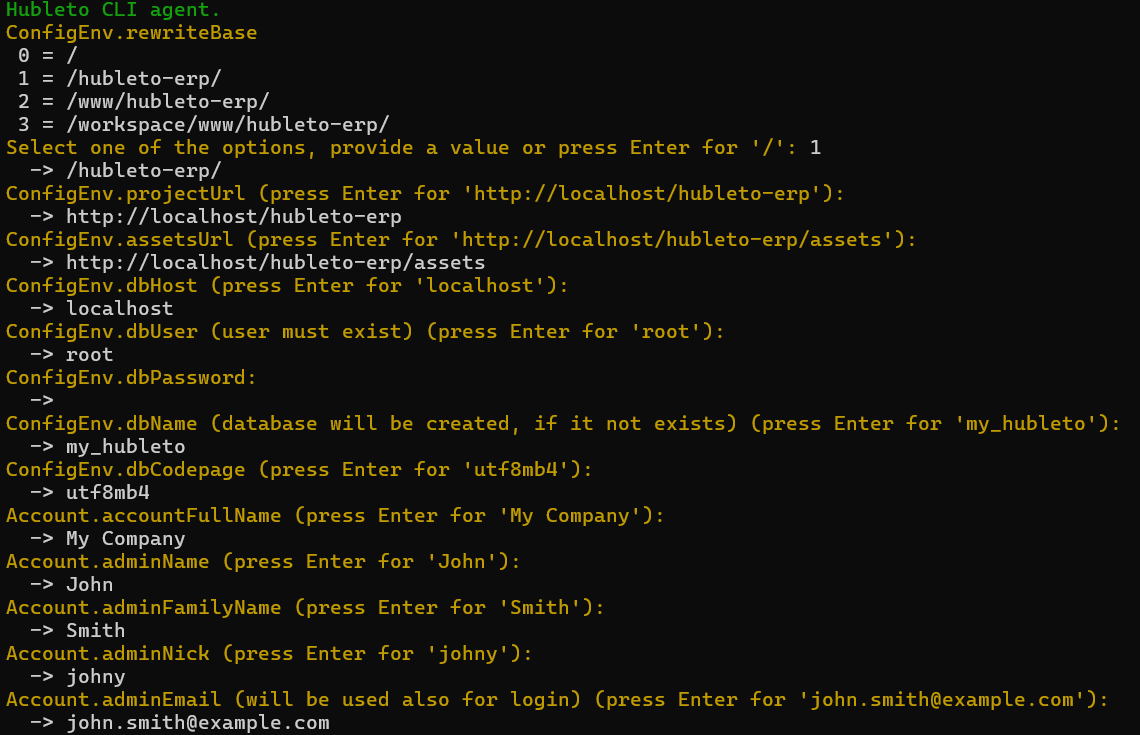 When launched, Hubleto asks for several parameters (see figure below) and then installs everything to run Hubleto ERP.